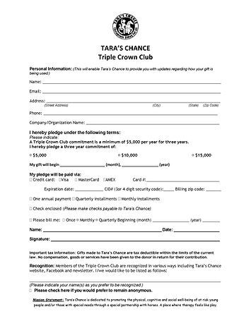 Each year, a select group of individuals become a part of a unique giving society. Triple Crown Club investors pledge an annual gift of: $5,000, $10,000, $15,000 or more for 3 years. These gifts (unless otherwise stipulated) provide ongoing support of the day to day operations at Tara’s Chance Therapeutic Riding Center.